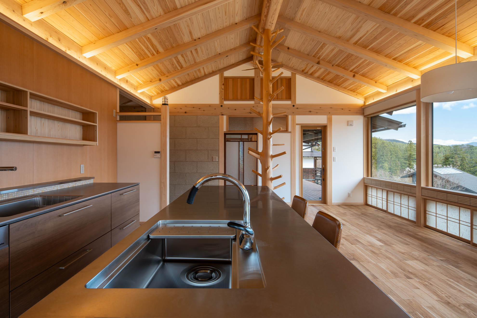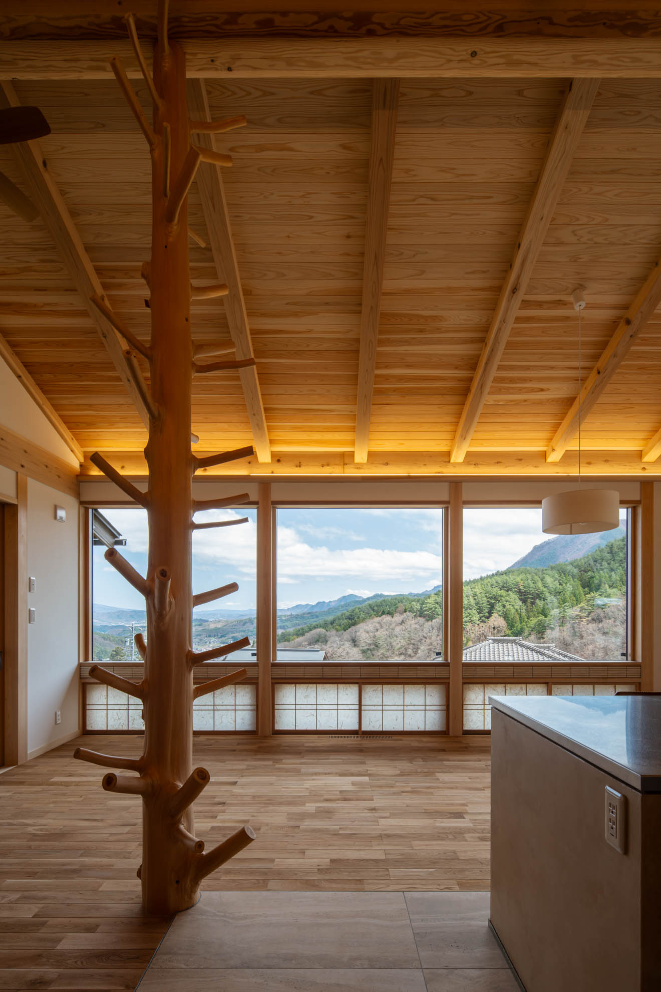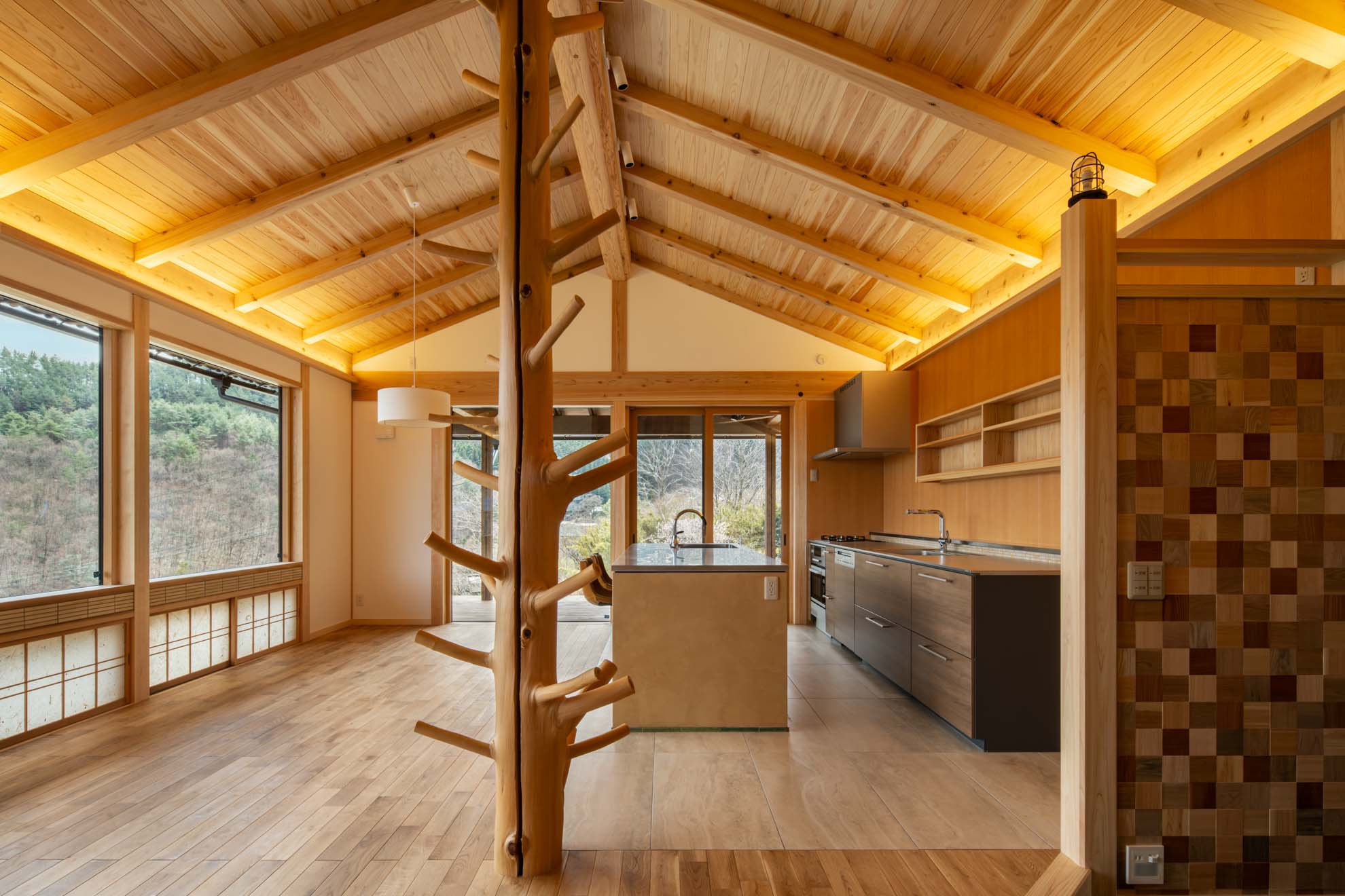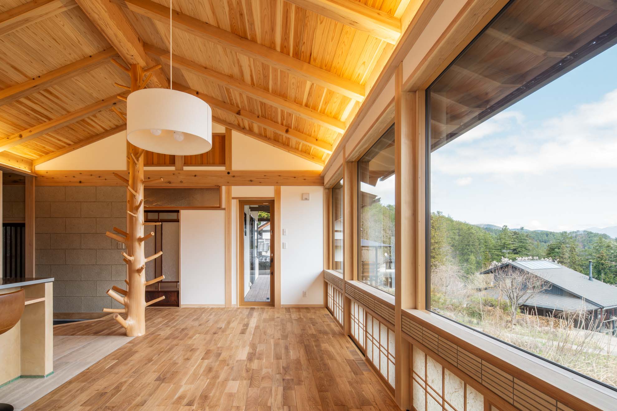 新築住宅:結の手 結の手プロジェクト 眼下に青木村の集落、その向こうに白い煙が立ち上る浅間山、遥かに八ヶ岳連峰、近くは夫神岳に子檀岳を望むという小高い場所に、能登から移住を決意したご夫婦のお家を作りました。私のホームページを見て「自然木を生かした設えが印象的だった」というお言葉に応え、今回もその枝付き丸太をLDKの真ん中に建物を支えるような形で創作してみました。イメージしたものを形にしていくというのはホントに楽しい仕事です。 Previous Post Next Post 関連リンク 2013年5月28日 はらぺこ青虫くん 2007年11月27日 猫と暮らす家 2025年2月10日 東御市 Qさんの家 安藤建築設計工房の仕事 一覧を見る 一覧を見る 一覧を見る 一覧を見る まずは住まいのQ&Aをご参照ください。 お問い合わせはお気軽に!