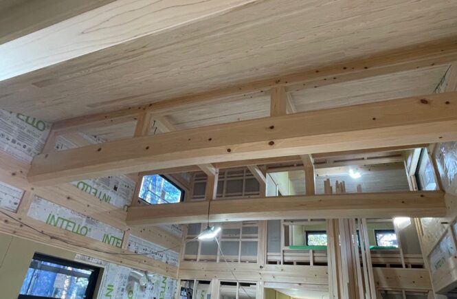 大工工事がいよいよ終盤に差しかかっています。今回も檜の丸太、4.5mの反り丸太を八角面取りの化粧仕上げで納めていただきました。まだ40代の大工さんですが、その丁寧な仕事ぶりには毎回感心させられます。全国組織の「削ろう会」に所属しているだけあって、柱の仕上げはまるで鏡のように光を放ち、思わず見入ってしまうほどです。